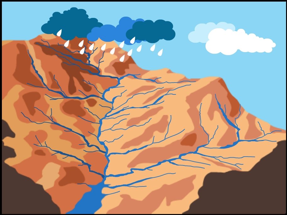 Uma bacia hidrográfica é a área territorial drenada por um rio principal e seus afluentes. É uma unidade de estudo fundamental na geografia física, pois nela ocorrem processos de captação de águas pluviais, escoamento superficial e recarga de aquíferos.